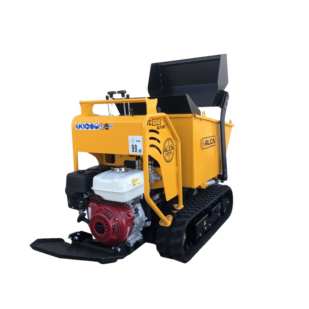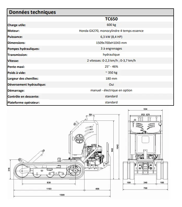 et plateforme opérateur - Sans accessoires ni optionsLe Mini Dumper TC 650 est le choix idéal pour transporter, charger et décharger des matériaux de construction, du bois et bien d’autres choses encore sur des terrains à forte pente.