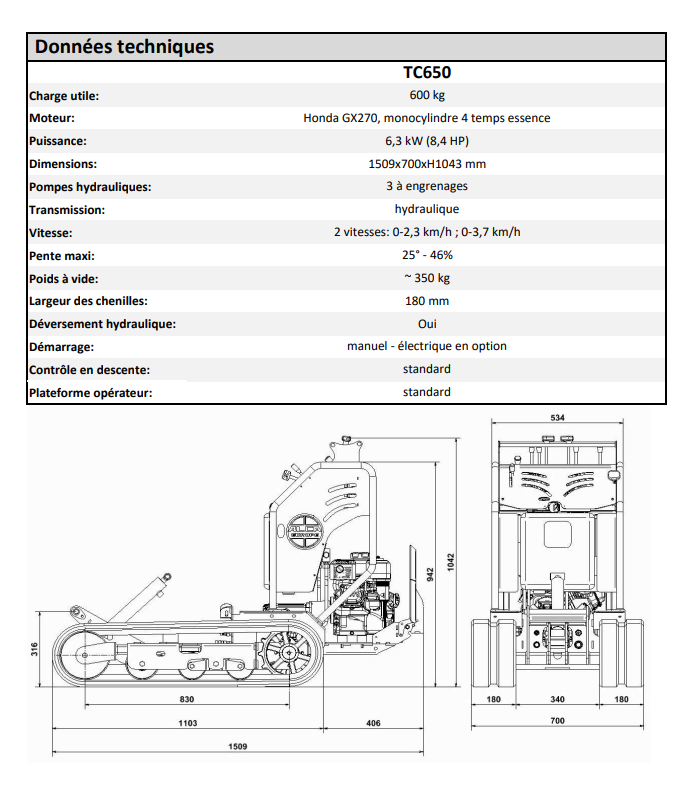 Mini Dumper TC 650 avec Elévateur avec fourches (150kg) et plateforme opérateur et PTO : 12420 € TTC