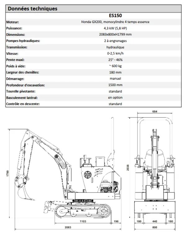 Caractéristiques de la Mini-Pelle ES 150 Plus :